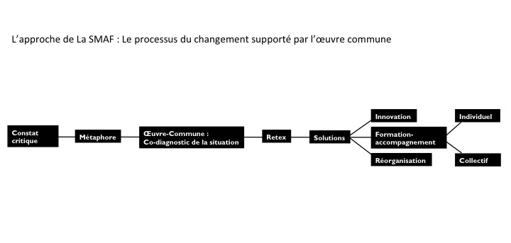 La SMAF développe une approche originale, issue des pratiques contemporaines de l’art et du design thinking, et s'appuie sur des travaux de recherche déjà bien établis, actuels ou en cours. Résolument tournée vers le « faire », la SMAF accompagne ses clients de l’expression des problèmes et des besoins à la réalisation concrète du changement. Pour accompagner, développer et valoriser les personnes, les savoir-faire et les ressources internes et externes à l’organisation, La SMAF a mis au point un protocole original et exclusif : l'œuvre commune.